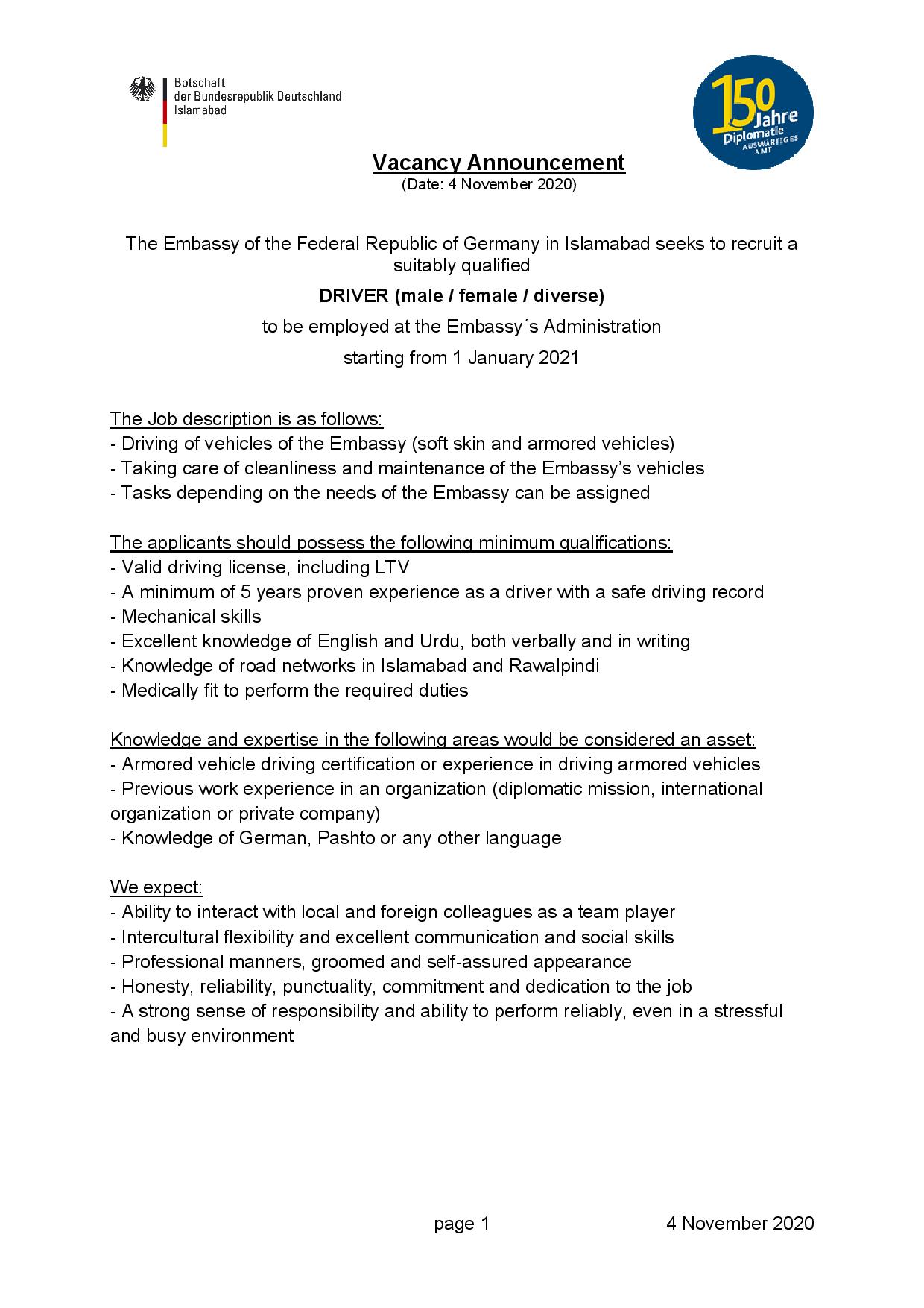 Bernhard Schlagheck On Twitter We Are Hiring The German Embassy In Islamabad Seeks To Recruit A Driver If Your Qualifications Match Our Requirements You Are Encouraged To Apply Until 20 November 2020 - Primary pass with valid driving license and traffic rules awareness.